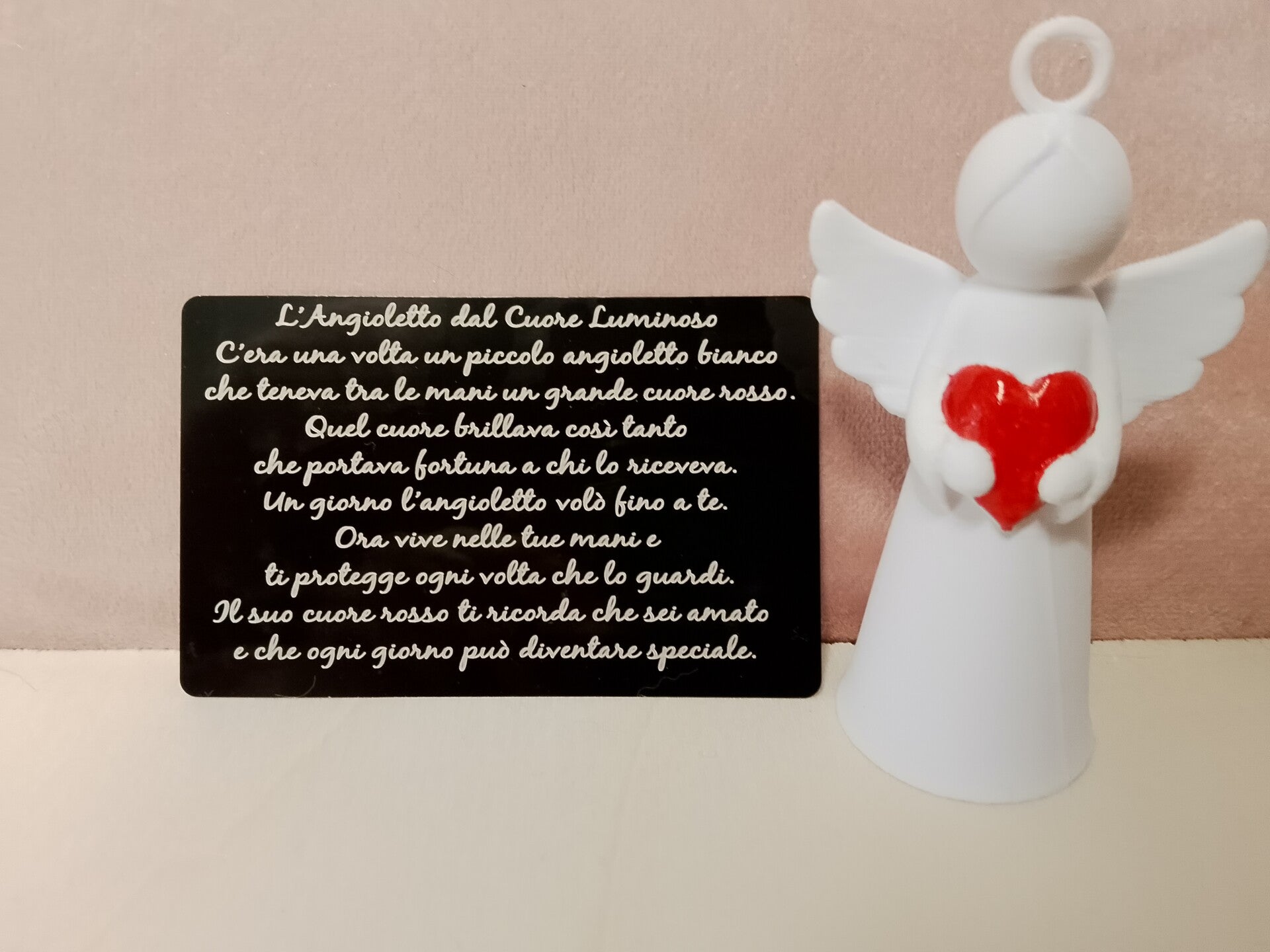 Si racconta che, in un piccolo laboratorio nascosto tra le colline, ogni notte un minuscolo angelo di luce prendesse forma tra le mani di un artigiano sognatore. Questo angelo, fatto di bianco puro, aveva un cuore rosso che brillava come una fiamma viva: era il Cuore del Coraggio.Un giorno l’angelo decise di lasciare il laboratorio per trovare qualcuno che avesse davvero bisogno della sua presenza. Volò piano piano, come sospinto da un destino gentile, finché non arrivò nelle mani di una persona speciale. Non parlava, non si muoveva, ma ogni volta che quella persona lo stringeva tra le dita, sentiva un calore che rassicurava.Si dice che il suo cuore rosso abbia il potere di assorbire le paure e restituire speranza, e che le sue piccole ali custodiscano desideri silenziosi finché non sono pronti a diventare realtà.Da allora, l’angelo porta con sé un’unica missione: ricordare a chi lo tiene che non è mai solo, e che anche nei momenti più difficili esiste sempre un piccolo cuore che continua a brillare per lui